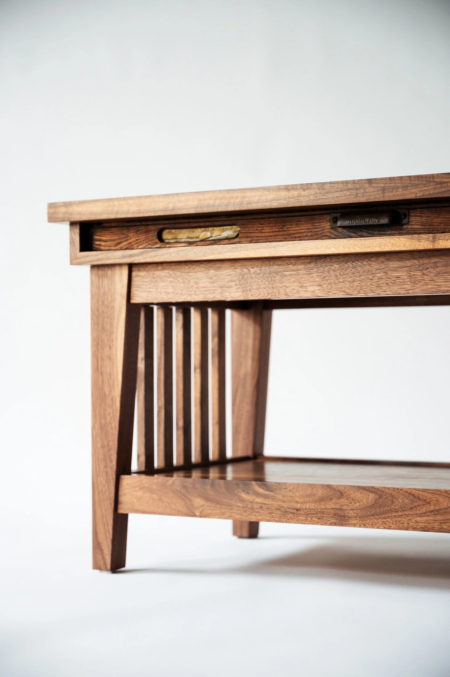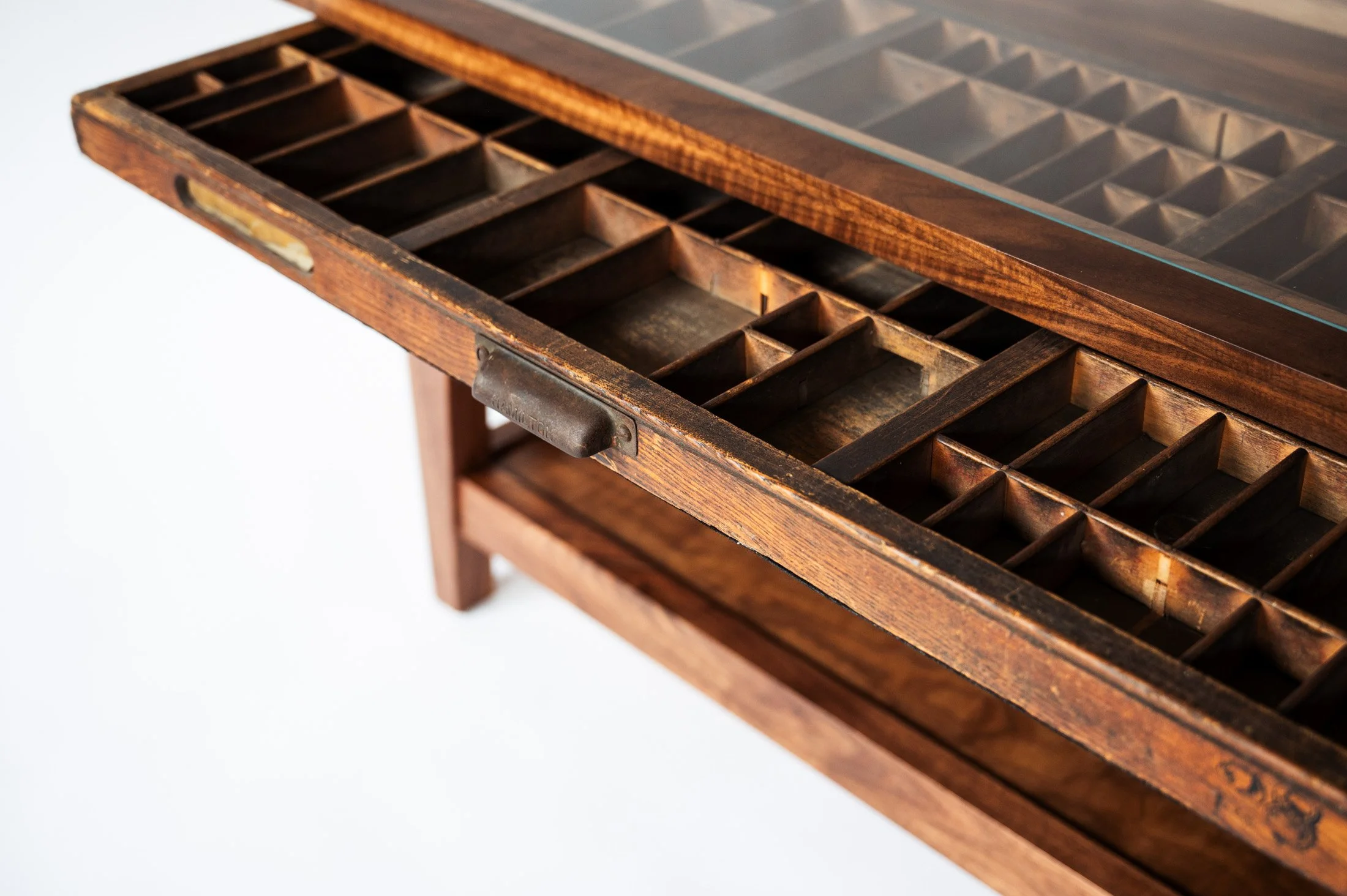 Intended to display a collection of delightfully whimsical treasures from the natural world, the design of this commissioned piece centers around an antique printer tray. Each niche and recess of the drawer is meticulously curated to showcase the intricacies and artistry of nature. The clean, simple lines of the table add interest to the piece without taking attention away from the natural art within.